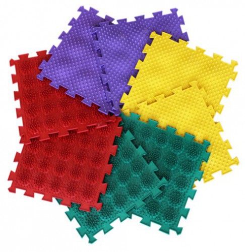 - Модуль «Мягкие Ёжики» - поверхность модуля покрыта иголочками, которые расположены на девяти полусферах. Коврик предназначен для проведения расслабляющего массажа стоп детей и взрослых. Терапевтический эффект достигается за счет воздействия стилизованных иголочек на поверхность кожи по принципу акупунктуры и точечного массажа.