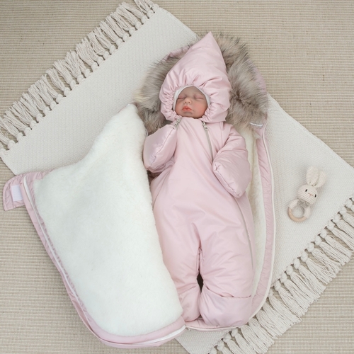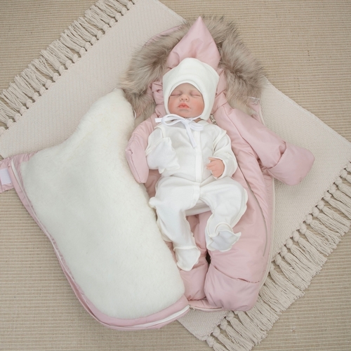 - Конверта: ткань верха - непромокаемая ткань – ROYAL DEWSPO (п/э 100%), наполнитель – синтепон 200 г/м2. (п/э 100%), подклад – овечья шерсть + искусственный мех (70% мех 30% п/э).