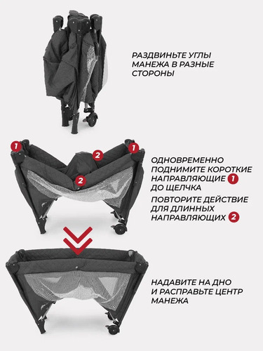 Манеж оснащен устойчивыми ножками и колеса со стопорами, для облегчения перемещения манежа.