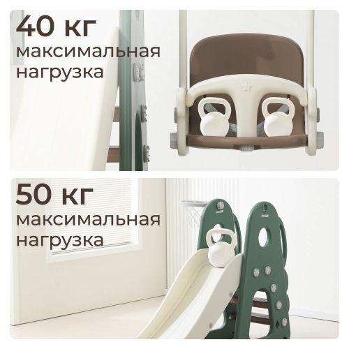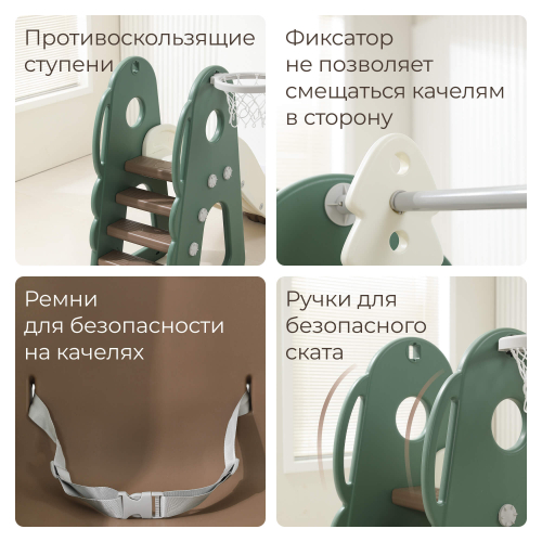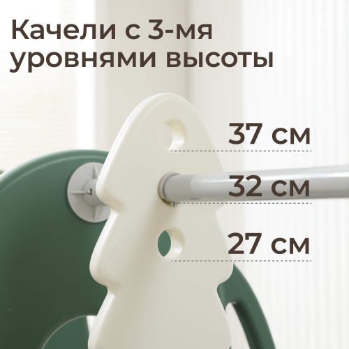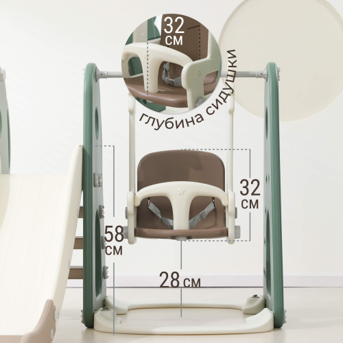 Особого внимания заслуживает оснащение качели и горки удобным механизмом регулировки высоты сиденья качелей с помощью надежных карабинов. Самостоятельно подобранная высота позволит адаптировать изделие под индивидуальные особенности каждого малыша. Качели оборудованы удобной и безопасной спинкой, предотвращающей случайное выпадение, а размер посадочного места 26,5×32 см гарантирует комфортное размещение любого ребенка независимо от телосложения.