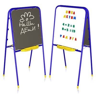 С одной стороны мольберта можно рисовать мелом. С другой маркерами на водной основе. Либо магнитами можно прикрепить лист бумаги для рисования красками.