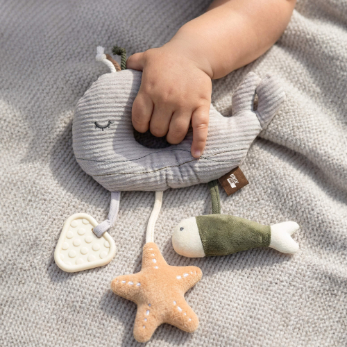 Маленькая игрушка для детей способствует развитию важнейших сенсорных навыков у детей младшего возраста. Благодаря своей форме и фактуре она стимулирует мелкую моторику рук и пальцев, развивает тактильные ощущения, улучшает координацию движений и укрепляет хватательные рефлексы. Необычный дизайн с подвесной звездочкой и рыбкой привлекает внимание ребёнка, вызывая интерес и радость.