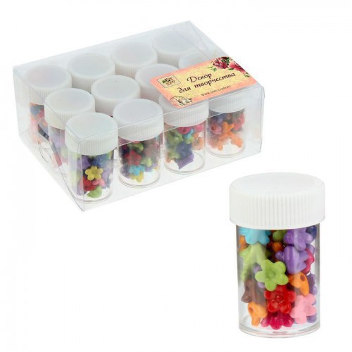 Набор включает в себя 12 баночек с разноцветными бусинами в виде милых колокольчиков. Незаменимый набор для всех, кто занимается любым видом декором, шитьем кукол и нарядов к ним, созданием украшений.