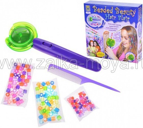 Набор состоит из машинки для нанизывания бисера на волосы, 100 больших бисеринок, 100 маленьких бисеринок, 30 резиночек и расчески. Техника создания прически достаточно проста и ее освоит каждый ребенок.