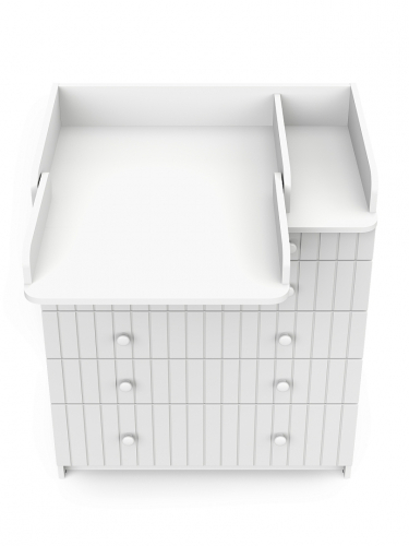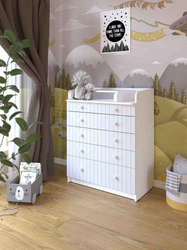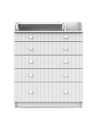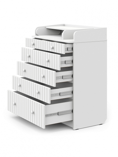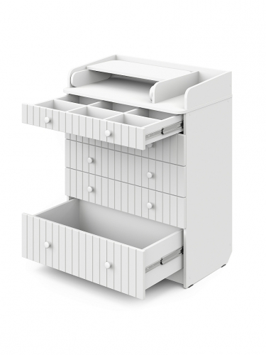Элегантный, выполненный в современном стиле и удобный пеленальный комод, в комбинациях контрастных оттенков благородной древесины с нежными, приятными на ощупь, с рельефными фасадами. В комоде используется пеленальный столик с простым и надежным, скрытым механизмом раскладывания. Есть отделение рядом с пеленальным столиком для средств по уходу за малышом в быстром доступе. Комод очень вместительный, благодаря пяти ящикам, которые установлены на надежные шариковые направляющие бесшумного хода. Нижний ящик большей глубины, а верхний с органайзером для удобства сортировки детских вещей.