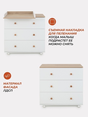 Съемная пеленальная рамка позволит использовать комод как пеленальный, пока ребенок маленький. В дальнейшем рамка снимается, не оставляя следов, и комод превращается в классический бельевой. Рамку можно установить справа или слева, делая уход а малышом максимально комфортным для родителей. Остальное место на комоде удобно подойдет под детскую косметику или игрушки.