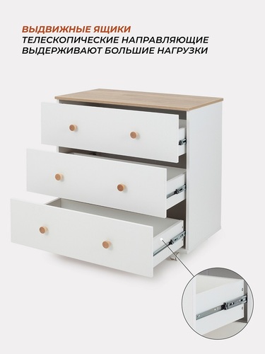 3 вместительны ящика на телескопических направляющих позволят комоду выдерживать большие нагрузки. Ящики легко выдвигаются и задвигаются, позволяя маме удобно хранить детские вещи.
