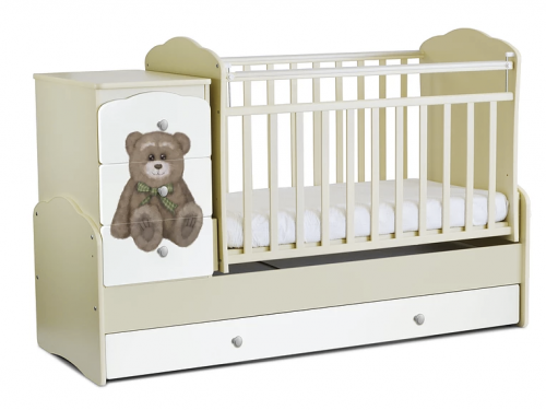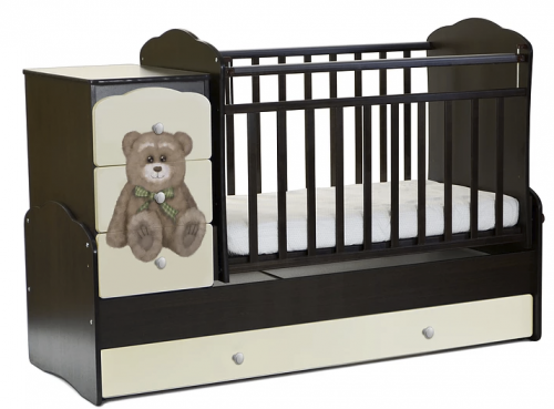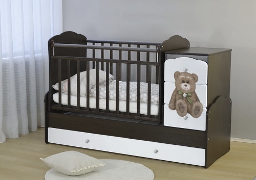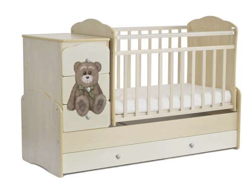 Кроватка-трансформер СКВ-9 Мишка фотопечать поперечный маятник 92003с оригинальным дизайном заменит сразу три предмета мебели. Для самых маленьких это детская кроватка с функцией качания, опускающейся передней панелью и двухуровневым дном. Комод с яркой фотопечатью на фасаде может устанавливаться слева или справа от кроватки. Для детей старше 3-4 лет, модель СКВ-9 92003 Мишка легко превращается в подростковую полноценную постель с ортопедическим ложем и высоким изголовьем.