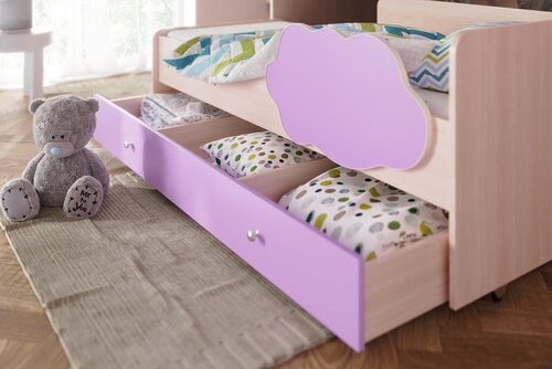 В нижней части кровати предусмотрен вместительный ящиком для белья и игрушек.