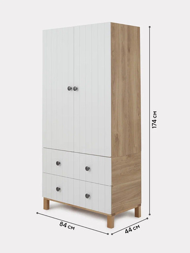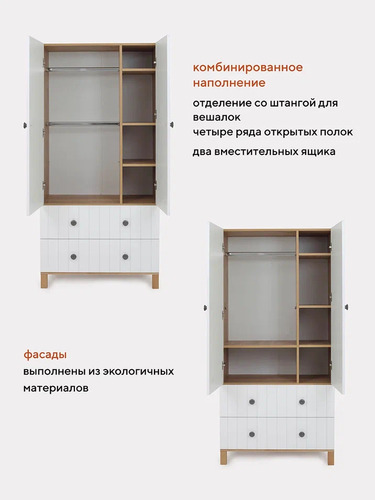 эргономичный шкаф включает в себя все, что понадобится для хранения вещей ребенка как в настоящее время, так и в будущем: объемное отделение с двумя штангами для плечиков и полочкой (все элементы съемные); четыре ряда полок; пара вместительных выдвижных ящиков