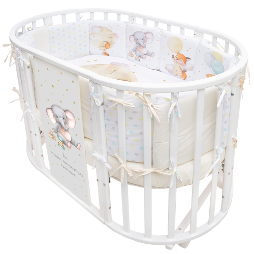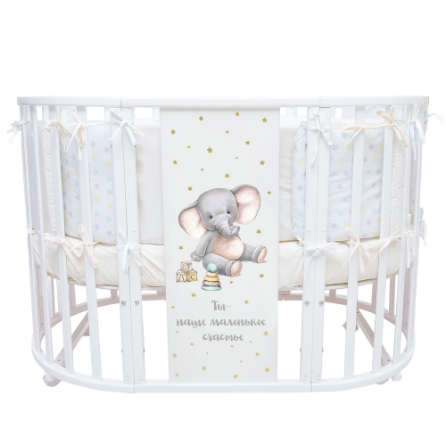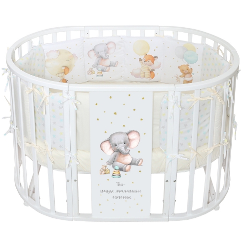Кроватка-трансформер Indigo Baby Sleep 7 в 1выполнена из массива березы и МДФ. Это удобная, уютная кроватка овальной формы с милым изображением животного на фасаде. На верхней кромке имеется накладка из ПВХ для защиты детских зубов и мебели. Мебель покрыта гиплаллергенной краской и лаком, благодаря чему родители могут не беспокоиться о здоровье малыша. В кровати нет опасных острых углов и необработанных поверхностей, которые теоретически могли бы нанести малышу травму. Ложе «ходит» по высоте, передняя стенка регулируется и при необходимости снимается.