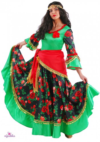 Обворожительная Цыганка Роза будет в центре внимание во время любого праздника. Свадебное застолье, корпоративная вечеринка, маскарад, спектакль - поводов может быть много, а костюм пригодится везде! Этот яркий наряд создаст непередаваемую атмосферу карнавала и веселья. А его обладательница сможет почувствовать себя более раскованной и зажигательной. Это законченный образ, к которому ничего не нужно добавлять. Наряд состоит из платья, платка, парика и ожерелья на голову - монисто.
