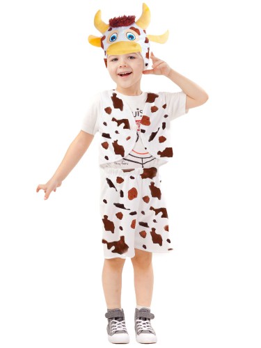 Костюм Теленок Гаврюша детский карнавальный для утренников и представлений. Очаровательный плюшевый костюм в пятнистой расцветке. Комплект включает шорты, жилетку и шапку-маску.