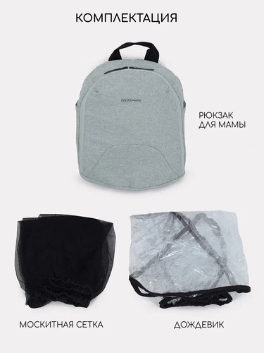 Комплектация: люлька, прогулочный блок, шасси, корзина для покупок, накидка на ножки, сумка для мамы, москитная сетка, дождевик.