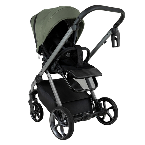 Рама складывается "книжкой" одним легким движением. Складывание возможно вместе с прогулочным блоком, независимо от того, каким способом он установлен. В сложенном виде коляска становится компактной, ее легко поместить в багажник или переносить с помощью транспортного ремня.