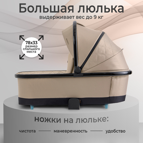 Люлька очень просторная, ее размеры составляют 78 x 33 см. Она оснащена ножками, поэтому может использоваться как колыбель. В комплекте также имеется мягкий матрасик с съемным чехлом для дополнительного комфорта вашего малыша. Бесшумный регулируемый капор с козырьком защитит ребенка от дождя, снега и ветра. Дополнительная вентиляция обеспечена окошком в основании люльке. Накидка на ножки имеет силиконовое окошко и пристегивается с помощью замков. Люлька легко снимается, благодаря системе «Memory Button».