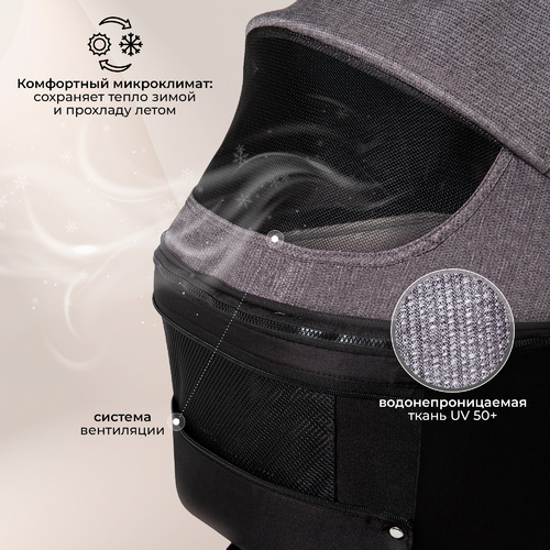 - глубокий регулируемый капюшон из непромокаемой ткани с пропиткой UV50+ опускается до самого бампера и способен защитить малыша от солнца и погодных ненастий;