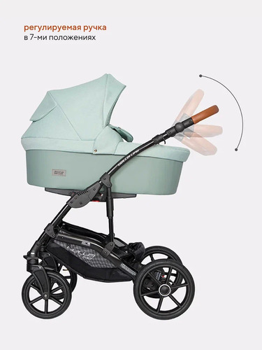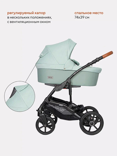 Коляска комплектуется сумкой, обивка капюшона выполнена из качественной водоотталкивающей ткани модных расцветок, низ люльки с отделкой из практичной Эко-кожи.
