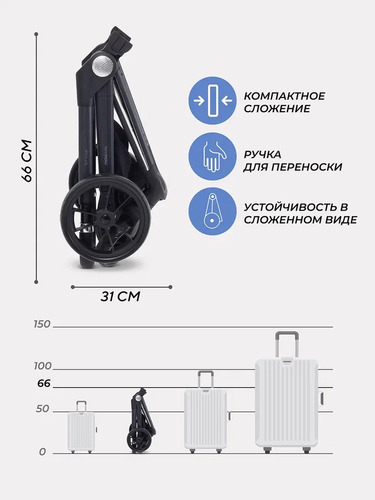 сложенная коляска устойчиво стоит в вертикальном положении, модель комплектована ручкой для переноски