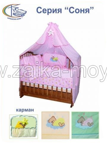 Комплект СОНЯ 2 предмета Комплект в кроватку серии СОНЯ. Служит для оформления детской кроватки, создания в ней комфорта и безопасных условий для сна младенца. Предотвращает движение сквозняком, создает затенение, защищает от случайных ударов о стенки кроватки.