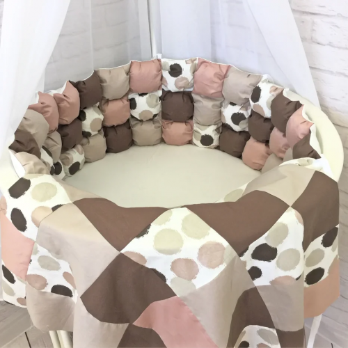 Комплект в кроватку Бонбон 5 в 1, шоколадно-ягодный - предназначен для оформления детской кроватки, создания в ней комфорта и безопасных условий для сна младенца. Обеспечит уют и прекрасный, спокойный сон вашему малышу. Красота техники исполнения с сочетанием пательных тонов и красивых узоров тканей является настоящим изыском в данном постельном белье. Ткани и расцветку можно выбрать на ваше усмотрение. Дополнительно можно заказать Юбку на кроватку, Балдахин.