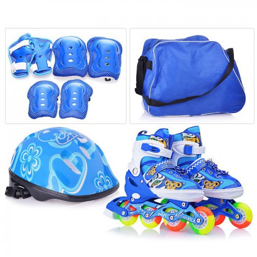 В наборе: - раздвижные ролики. - пенопластовый шлем. - защита для локтей, коленей и кистей. • Внутренний размер шлема (20х17 см.) • Размеры роликов: 34-39. • Колёса из полиуретана (d=7 см.) • Пяточный тормоз. • Застёжка: шнуровка, липучка, клипса. • Материалы: пластик, полиэстер. • Соответствует требованиям безопасности и стандартам качества продукции. • Для детей от 3-х лет.