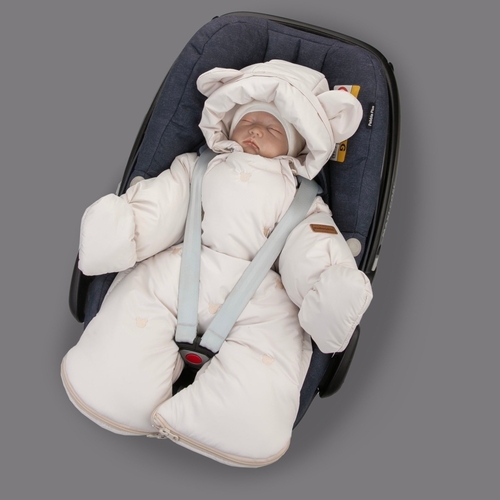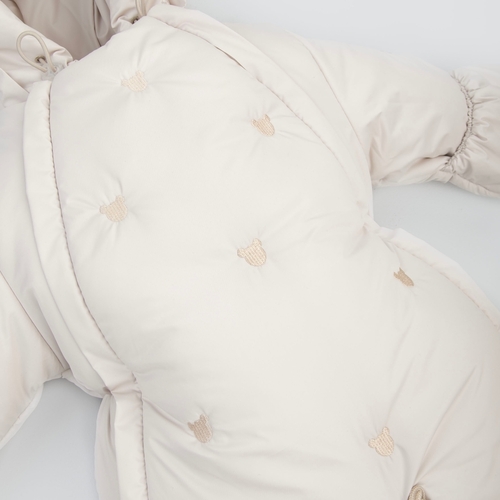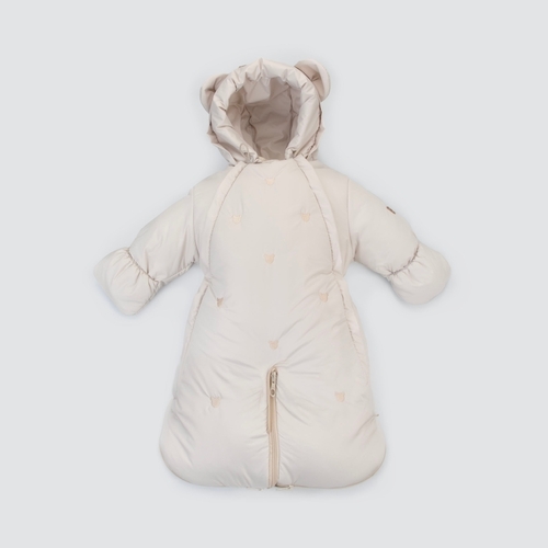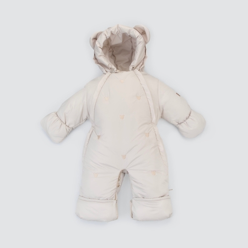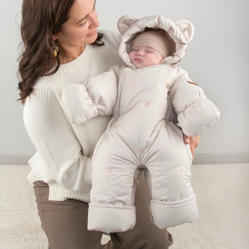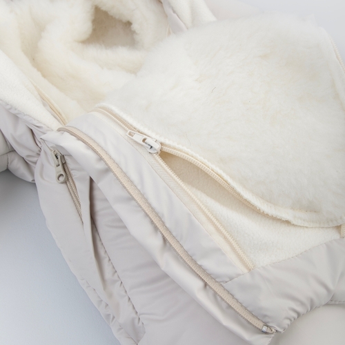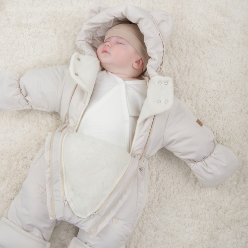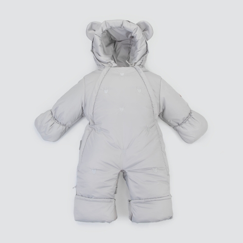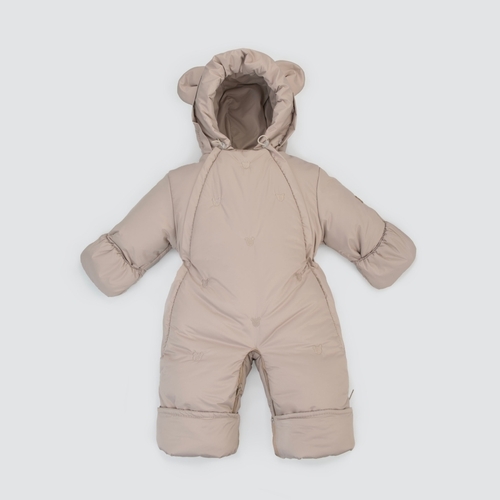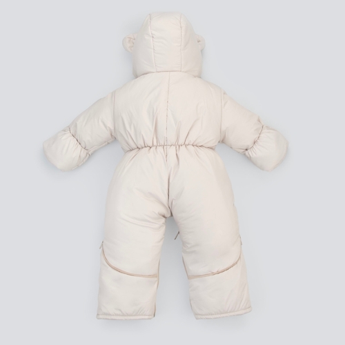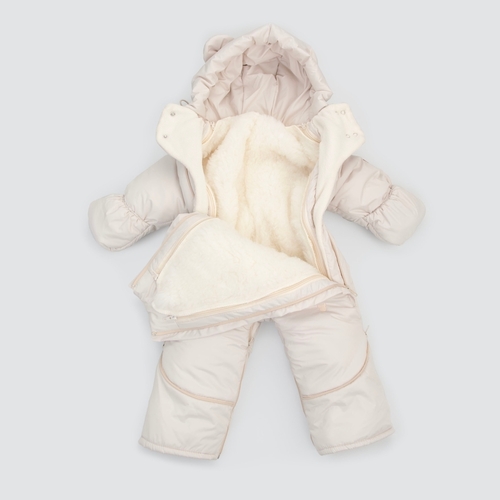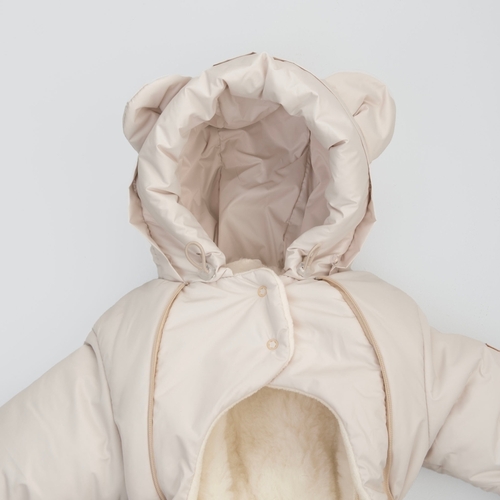 Глубокий, хорошо проработанный капюшон имеет затяжники, внутренняя часть капюшона без меха, две молнии по бокам помогут вам легко одеть и снять комбинезон с малыша.