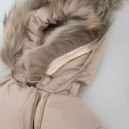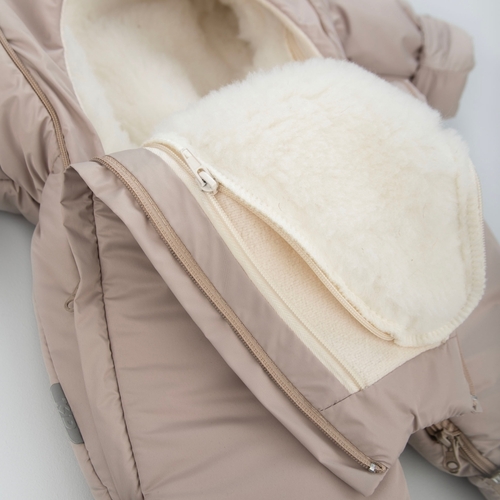 Глубокий, хорошо проработанный капюшон имеет затяжники, внутренняя часть капюшона без меха, две молнии по бокам помогут вам легко одеть и снять комбинезон с малыша.