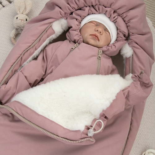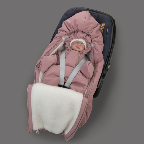 - Конверта: ткань верха - курточная ткань Белфаст (п/э 92%, нейлон 8%), наполнитель – синтепон 200 г/м2 (п/э 100%), подклад – овечья шерсть + искусственный мех (70% мех, 30% п/э)