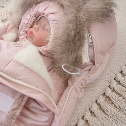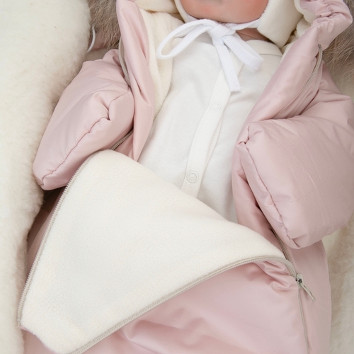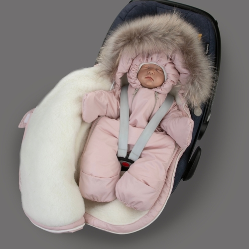 - Конверта: ткань верха - непромокаемая ткань – ROYAL DEWSPO (п/э 100%), наполнитель – синтепон 200 г/м2. (п/э 100%), подклад – овечья шерсть + искусственный мех (70% мех 30% п/э).