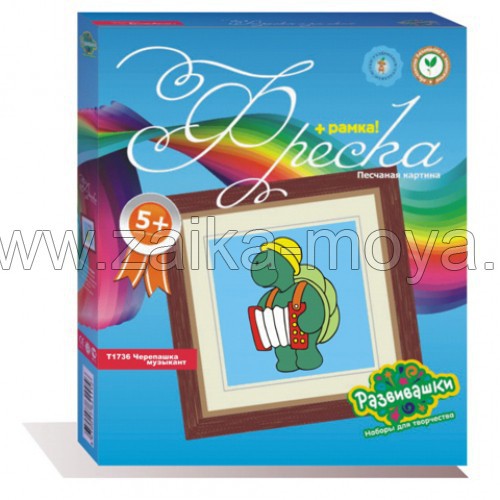 Фреска "Черепашка музыкант" - это классический набор с использованием трехслойной клеевой основы. Огромное удовольствие от работы и результата гарантировано не только детям, но и родителям. В комплекте пластиковая рамка с подставкой. Забавный рисунок, мелкий песок и яркие цвета. Работа с фреской развивает мелкую моторику рук, координацию движений и усидчивость ребенка. Состав: модель рисунка 14,5 х 14,5 см., набор цветного песка, пластиковый стек, пластиковая рамка, инструкция, цветная коробка.