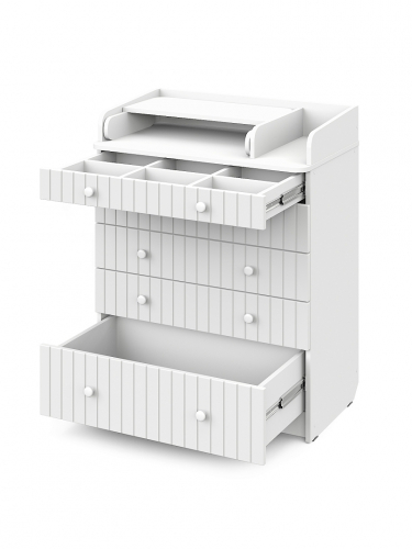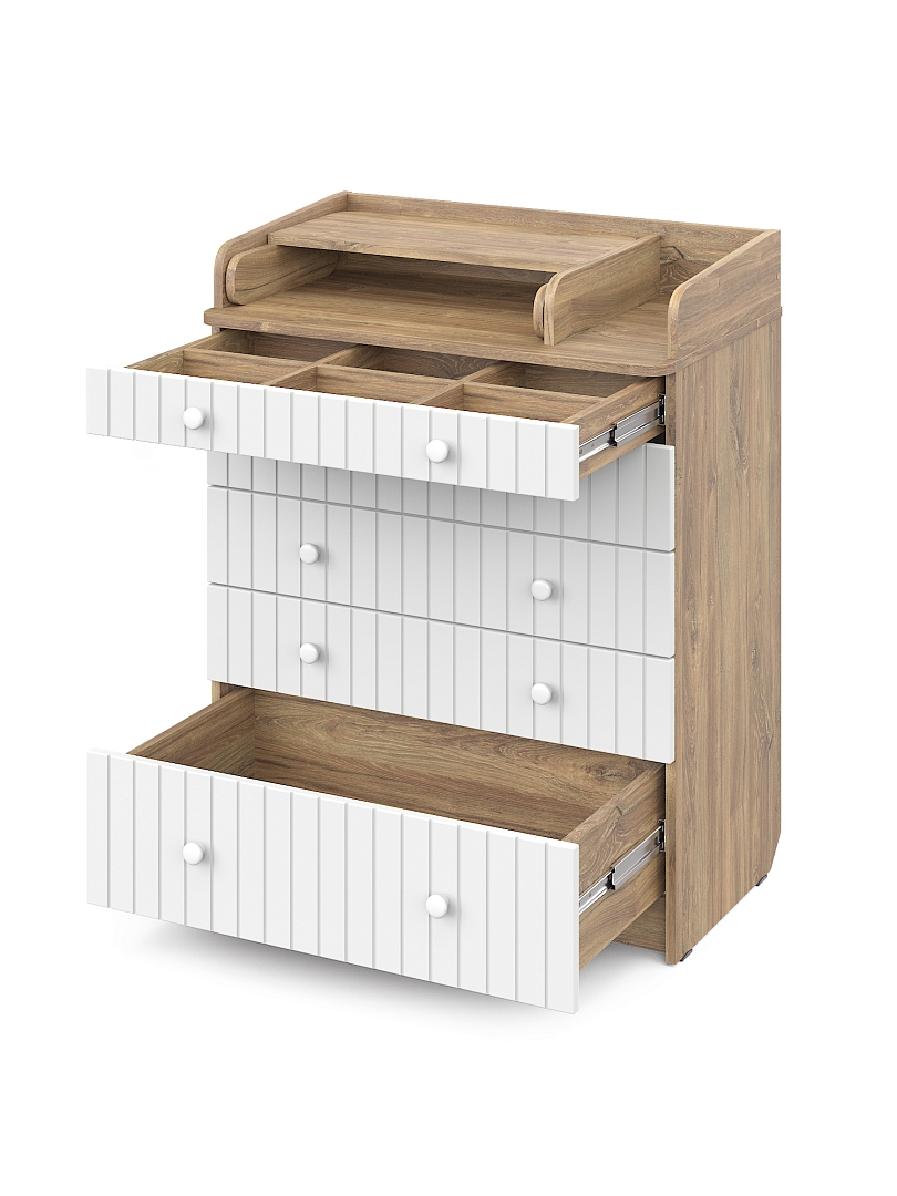 Элегантный, выполненный в современном стиле и удобный пеленальный комод, в комбинациях контрастных оттенков благородной древесины с нежными, приятными на ощупь, с рельефными фасадами. В комоде используется пеленальный столик с простым и надежным, скрытым механизмом раскладывания. Есть отделение рядом с пеленальным столиком для средств по уходу за малышом в быстром доступе. Комод очень вместительный, благодаря пяти ящикам, которые установлены на надежные шариковые направляющие бесшумного хода. Нижний ящик большей глубины, а верхний с органайзером для удобства сортировки детских вещей.