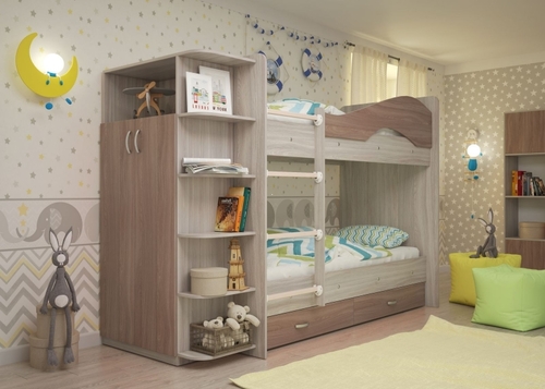 Шкаф для двухъярусной кроватки Мая безопасен в использовании, обладает красивым и интересным исполнением, есть место и для игрушек, и для вещей.