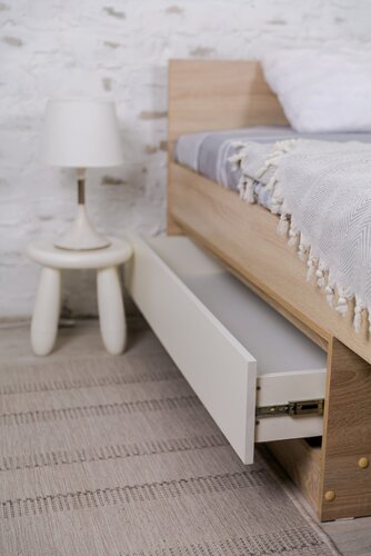 Данная модель выполнена в сочетание двух цветов Дуб сонома/и белого цвета ЛДСП. Спальное место 2000*900 мм, матрац ложится на деревянное основание (ладе). Кровать имеет небольшой выдвижной ящик на направлящих полного выдвижения и нишу под кровать. Собирается на евровинты.