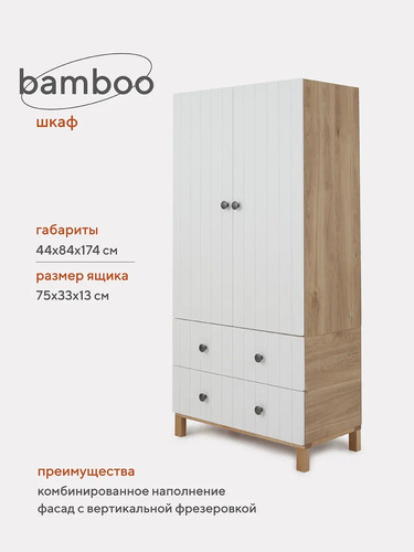 Шкаф Rant Bamboo - идеальное решение для хранения детских вещей. Качественный и надежный шкаф с объемными отделениями, штангами для плечиков, полочками внутри шкафа и выдвижными ящиками. Вы сможете менять уровни штанг и полочек по мере роста ребенка. Ящики выдвигаются бесшумно, не тревожа ребенка.