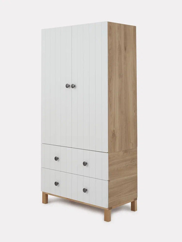 эргономичный шкаф включает в себя все, что понадобится для хранения вещей ребенка как в настоящее время, так и в будущем: объемное отделение с двумя штангами для плечиков и полочкой (все элементы съемные); четыре ряда полок; пара вместительных выдвижных ящиков