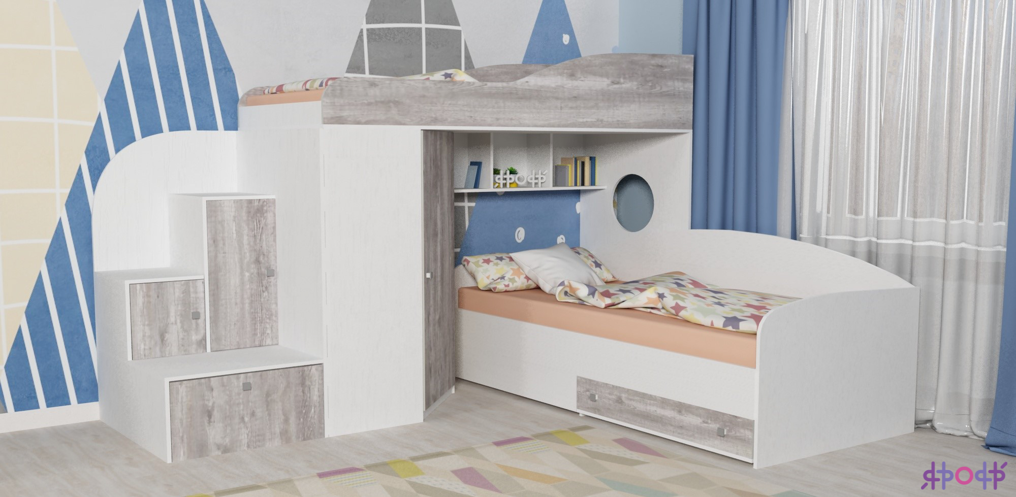 Кровать чердак Ярофф Кадет 2Идеальная модель для тех, у кого двое детей. Эта мебель представляет собой два спальных места. Верхнее сальное место имеет размеры 80*190 см. Волнообразный борт служит защитой, его высота в разных местах – 200 – 350 мм. Нижнее спальное место имеет размеры 90*200 см. Внизу имеется выдвигающийся ящик. Между ярусами имеется книжная полка. Она поделена на три секции. Оригинальная лестница в виде трех тумбочек разных размеров, является дополнением к кроваткам. В ящики можно складывать все что угодно.