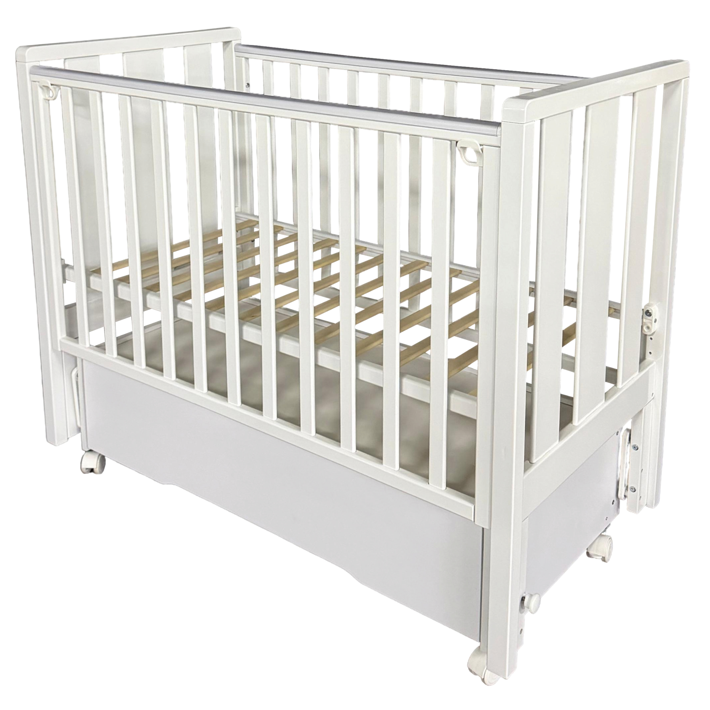 Кроватка Lada 1 выполнена из экологически чистых материалов, которые абсолютно безопасны для ребенка. Модель оснащена подвижными передним ограждением с удобным механизмом фиксации в двух положениях по высоте. В комплекте с кроватью есть универсальный маятниковый механизм, что позволяет собрать кровать либо с поперечным маятником, либо с продольным, в зависимости от того, какой тип укачивания Вам необходим. Удобный вместительный ящик на шариковых направляющих позволяет хранить в нем вещи не опасаясь за то, что внутрь попадет пыль. Предусмотрена одновременная установка колес и маятникового механизма.