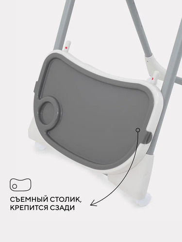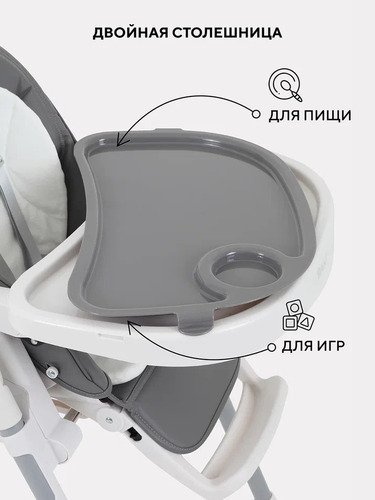 двойная столешница. Для принятия пищи используется верхняя столешница серого цвета. В ней имеется круглое отделение под поильник. Серую столешницу очень удобно снимать сразу после еды, чтобы помыть или протереть. Нижняя столешница используется для игр, лепки, рисования.
