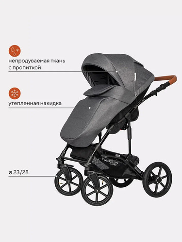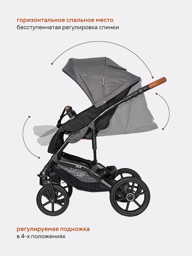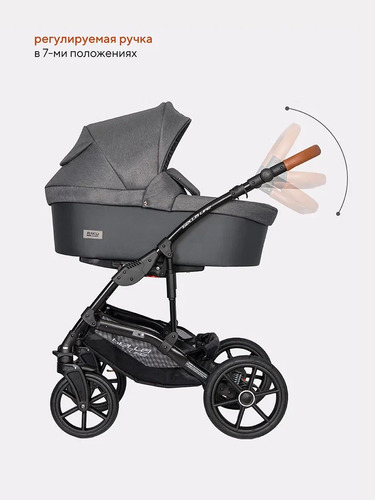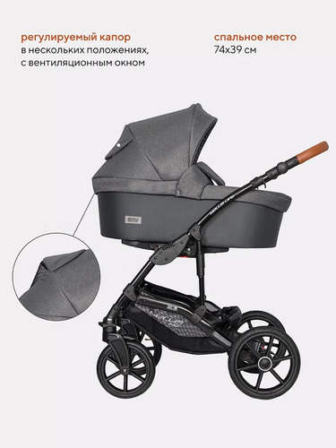 Люлька для малыша предусмотрена для новорожденного ребенка и до примерно 6-8 месяцев. Она имеет высокие борта, ровное жесткое основание с ортопедическим матрасиком. Для удобства ребенка предусмотрен наклон спинки в нескольких положениях с внешней регулировкой. Вся внутренняя обивка выполнена из максимально натуральных материалов и снимается для стирки. Чтобы закрыть ребенка от любой непогоды предусмотрена удобная накидка на люльку с высоким отворотом от ветра и пыли и большой многопозиционный капюшон с козырьком от солнца и вентиляционным окошком.